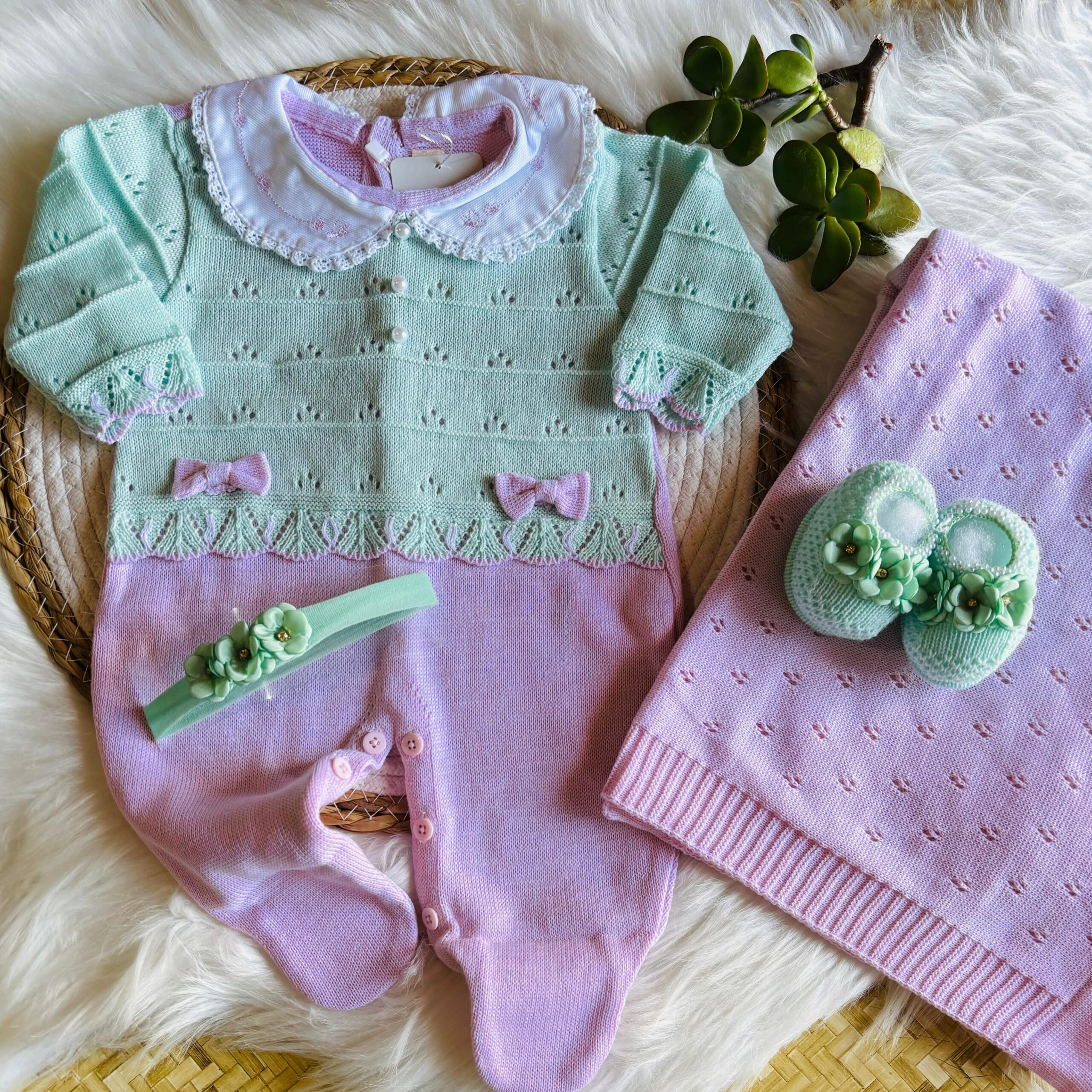 Confeccionado em tricot de linha 100% acrílico antialérgico.