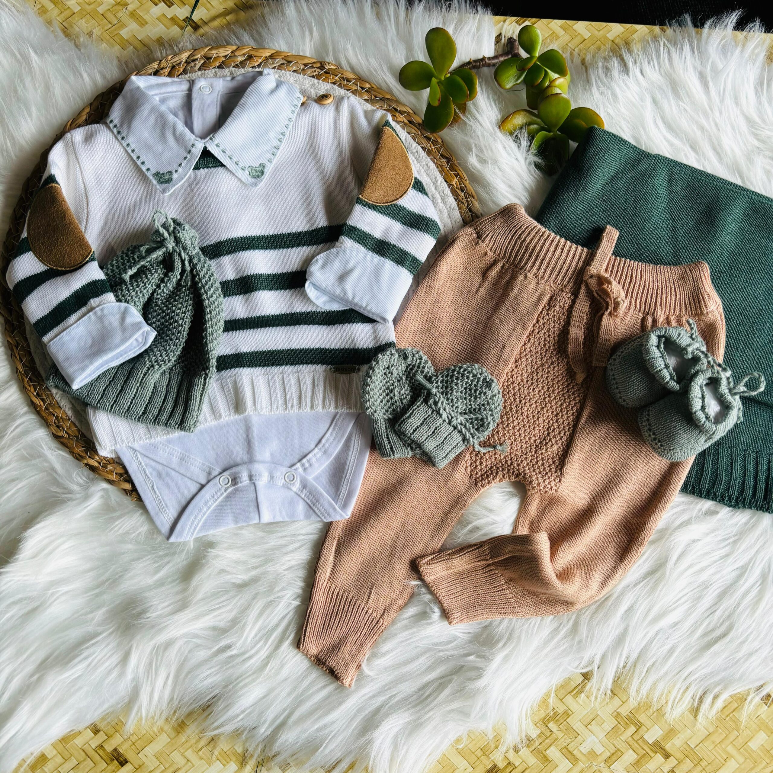 Confeccionado em tricot de linha 100% acrílico antialérgico.